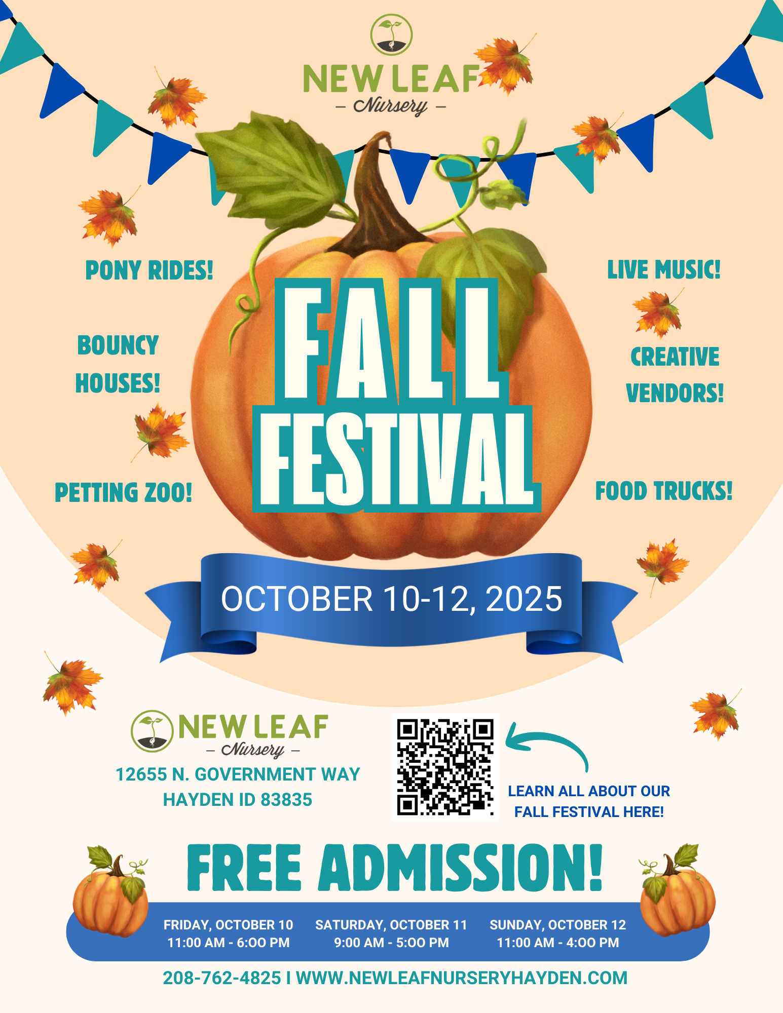 Get ready for an unforgettable weekend at New Leaf Nursery’s Annual Fall Festival — celebrating 10 amazing years of fall fun, community, and tradition! This beloved event is back and bigger than ever, bringing you a fantastic lineup of activities for the whole family. Best of all, admission is always FREE — so everyone can join in on the fun!